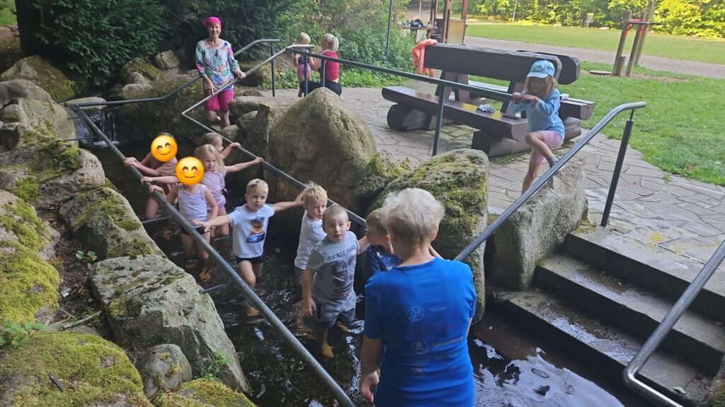 An einem Sommertag wanderte die Kindergartengruppe zum Wasserspielplatz in das Ilsetal. Elvira Stecker vom Kneippverein aus Ilsenburg erwartete uns und startete mit einem Bewegungsprogramm zur Erwärmung, sowie einer Erläuterung zum Wassertreten.
